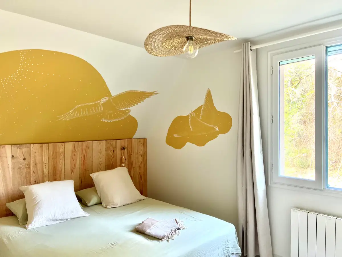 Chaque chambre a une décoration unique et poétique sur le thème des animaux de Dordogne. Pour votre confort et votre bien-être, le linge de lit est en coton bio, ainsi que le linge de toilette (serviettes et gant) et la serviette foutas pour la piscine. Pensée telle une cabane, le mobilier comme la penderie et la console est en bois. Vous disposez aussi d'un sèche-cheveux et d'un lit bébé sur demande.