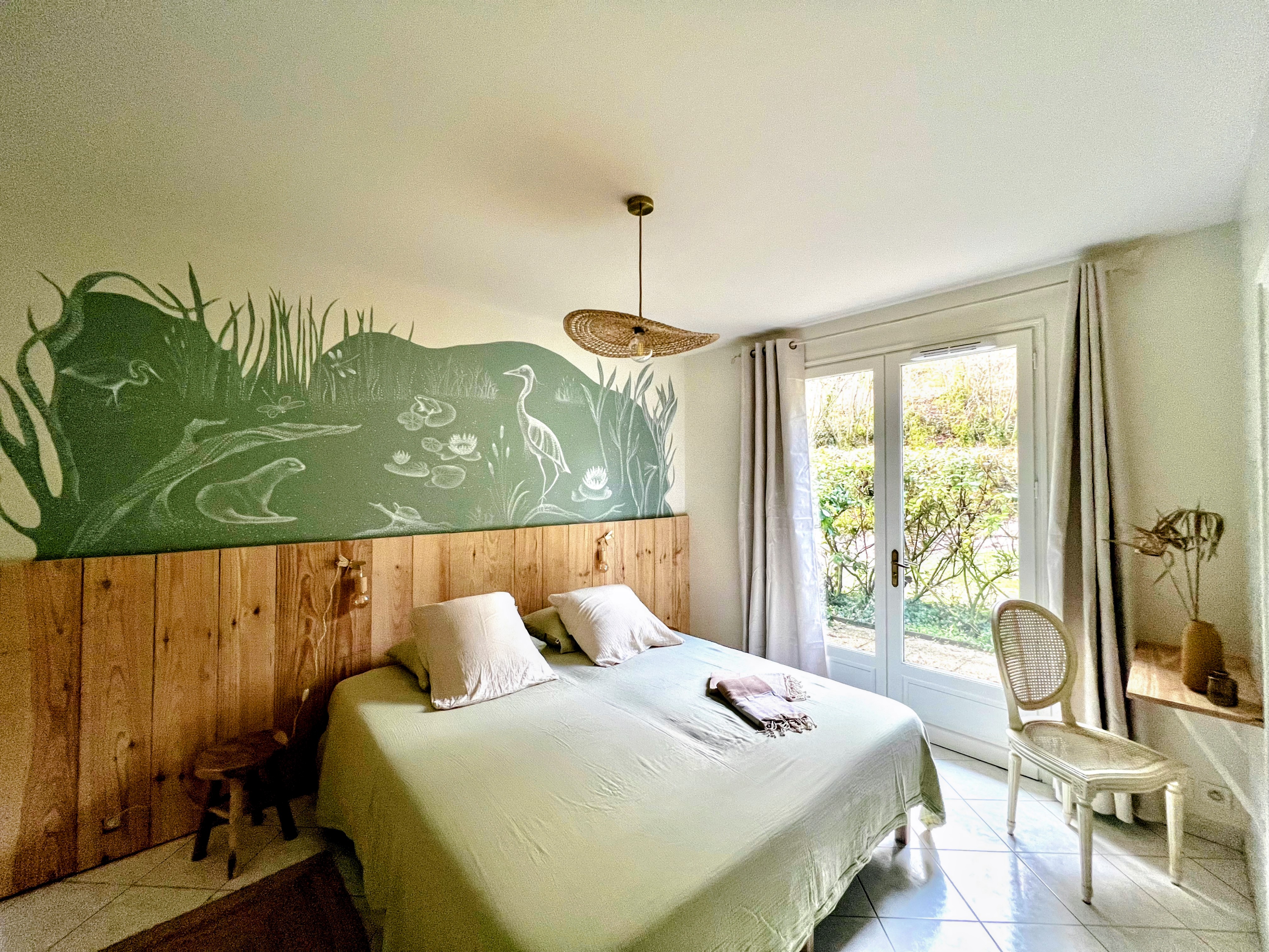 Une décoration unique et poétique, les chambres ont été pensées comme des cabanes. À la place d'une TV écran plat, pour vous évader c'est une fresque qui orne les murs de chacune des chambres, dessinée à la main point par point par l'artiste Saulyne.